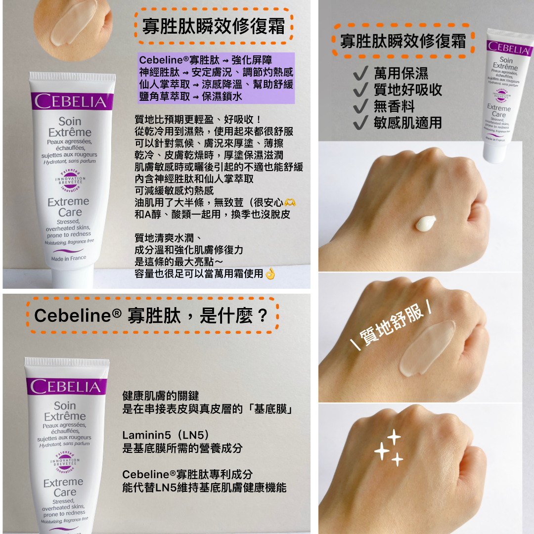 上個月因為長時間曬太陽,臉頰變得超級敏感,但Cebelia 寡胜肽瞬效修復霜,完全就是敏感肌膚的救星,我很喜歡厚敷10分鐘左右再洗掉,它擦起來涼涼的很舒服,洗完後泛紅肉眼可見的變淡了呢!