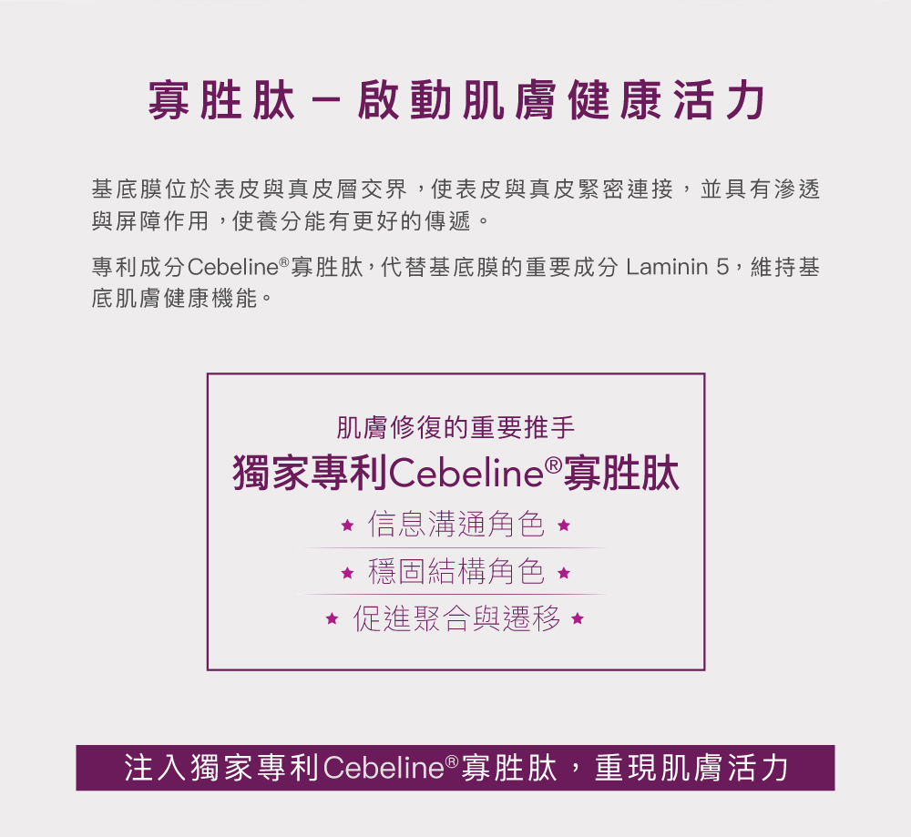 Cebelia®專利寡胜肽-獨家專利成份,穩固肌膚結構,恢復與強化基底【強化修護】