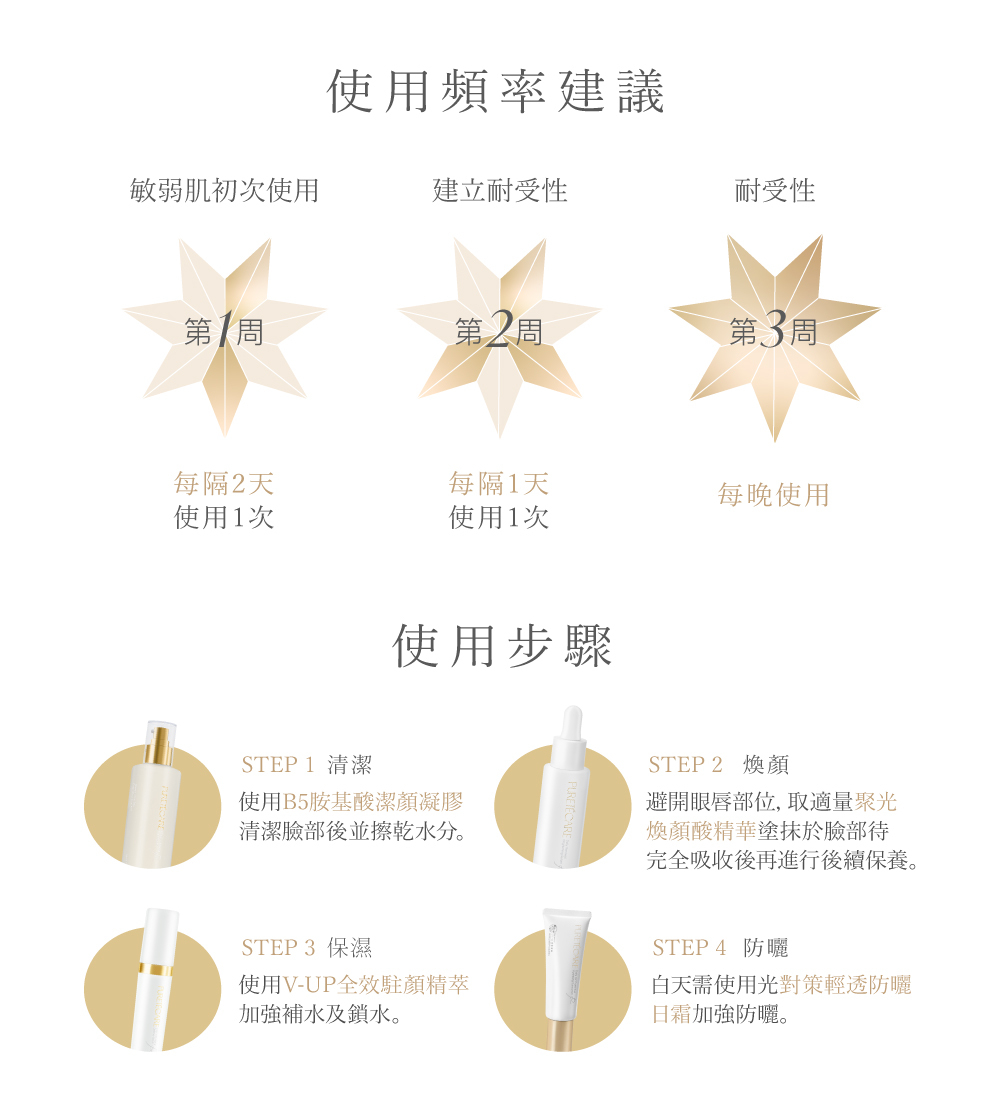 內含:B5胺基酸潔顏凝膠3ml +V-UP全效駐顏精萃2ml+聚光煥顏酸精華2ml。