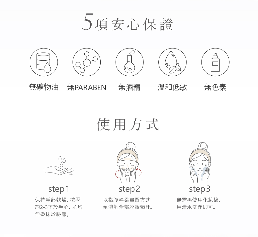 使用方式:按壓適量以全臉畫圓方式輕柔按摩,直到彩妝皆被溶解卸除後再洗淨,並搭配潔顏產品清潔即可。