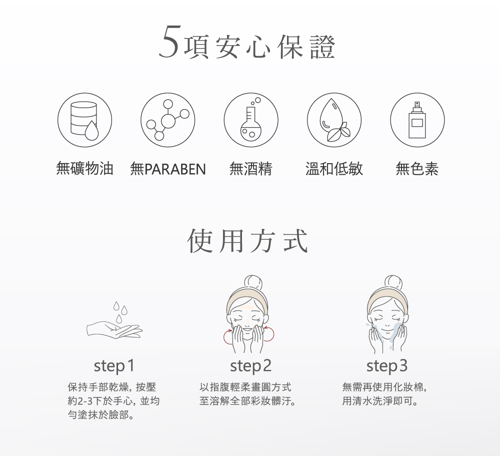 使用方式:按壓適量以全臉畫圓方式輕柔按摩,直到彩妝皆被溶解卸除後再洗淨,並搭配潔顏產品清潔即可。