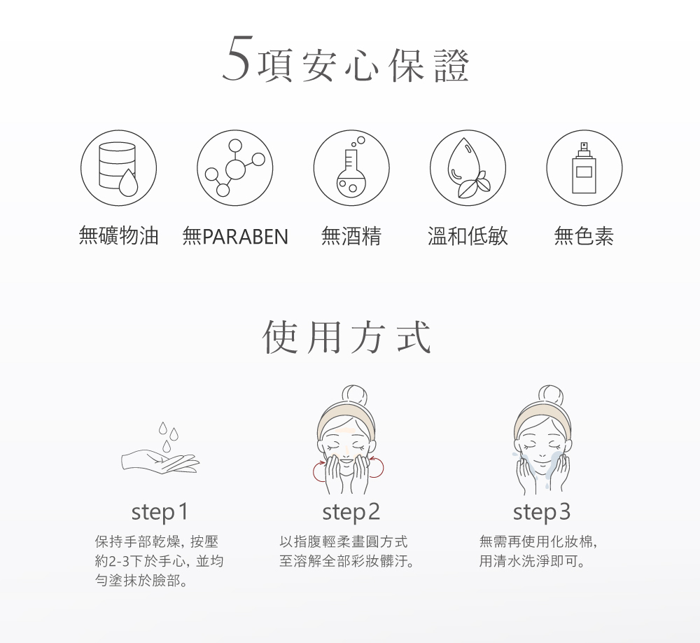 使用方式:按壓適量以全臉畫圓方式輕柔按摩,直到彩妝皆被溶解卸除後再洗淨,並搭配潔顏產品清潔即可。
